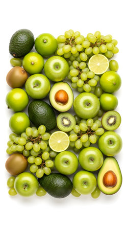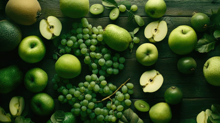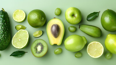 A colorful flat lay of fresh green fruits, including kiwi, lime, and grapes, showcasing vibrant textures and natural beauty ideal for healthy lifestyle themes.