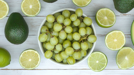 A top view of fresh green grapes in a white bowl surrounded by vibrant limes and avocados on a wooden surface, ideal for healthy lifestyle imagery.