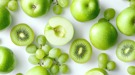 A visually appealing arrangement of fresh green apples, sliced kiwi, and grapes showcases vibrant colors and textures, perfect for health-conscious themes.