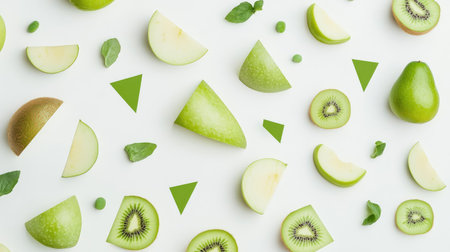 A beautiful arrangement of sliced green fruits including kiwi and apple on a clean white background, perfect for health and wellness themes.
