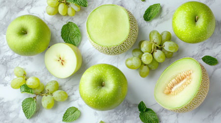 A vibrant arrangement of fresh green fruits including apples, grapes, and melon on a marble background, perfect for healthy lifestyle and culinary inspiration.