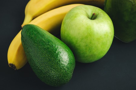 Avocado, banana, apple fresh healthy fruits on dark background.