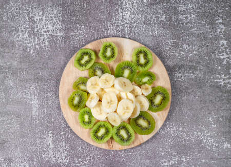 Step 4. Slicing fruit for smoothies. Peeled banana and kiwi are cut on a cutting board.