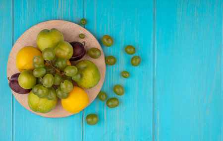 top view of fruits as grape pluots plums nectacots on cutting board and grape berries on blue background with copy space