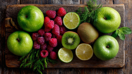 A vibrant arrangement of fresh green apples, raspberries, lime, lemon, kiwi, and mint on a rustic wooden surface, inviting healthy eating and culinary creativity.