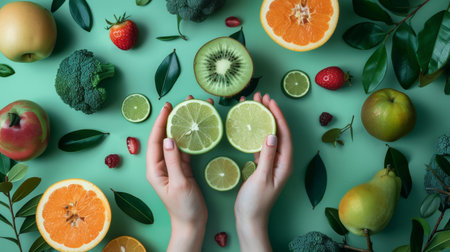 Top view of hands holding sliced citrus fruits, surrounded by tropical fruits such as kiwi, mango, and avocado on a green background.