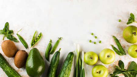 Green fresh vegetables and fruits. Vegetarianism. Copy space.