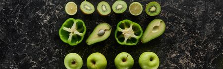 panoramic shot of peppers, cucumber, kiwi, apples, limes and avocado
