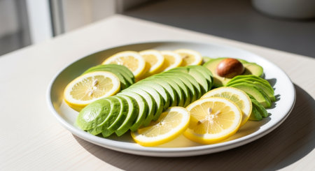 A plate of sliced lemons and avocados is displayed on a white table, creating a visually appealing and healthy arrangement.