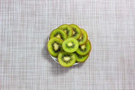 Sliced slices of ripe kiwi spread out on a plate. Top view.