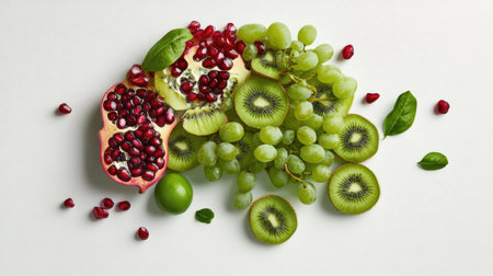 A vibrant arrangement of fresh fruits featuring pomegranate halves, green grapes, sliced kiwi, and a lime on a light background. Ideal for healthy eating themes.