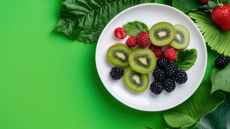 Fresh breakfast plate with kiwi and berries, artfully arranged with leaves on the side