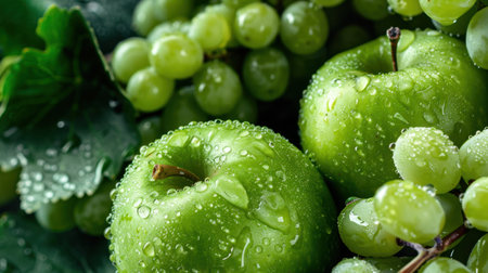 This image features fresh green apples and grapes adorned with water droplets, highlighting their freshness and vibrant nature against lush green leaves.