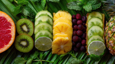 Explore a vibrant display of fresh fruits arranged artfully on lush green palm leaves. This beautiful composition is perfect for promoting health and nutrition themes.