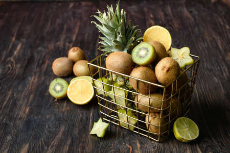 Basket with fresh juicy fruits on wooden background
