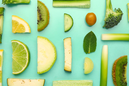 Green vegetables and fruits close-up, soft focus. Vegetarianism healthy lifestyle proper diet food