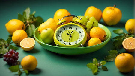 Alarm clock with different fruits in the kitchen