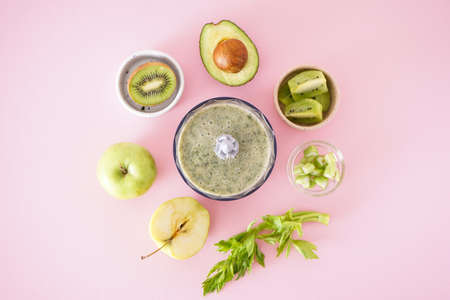 Fresh and healthy ingredients for smoothie or coctails on the green backgrounds wall with copy space.