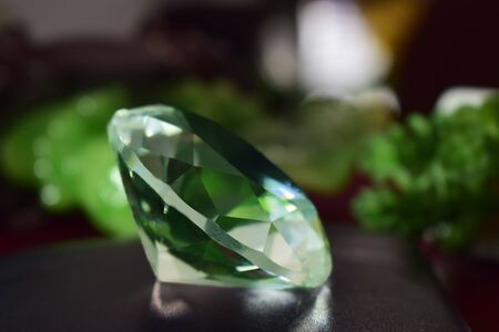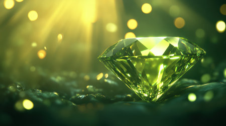 This captivating image features a sparkling green diamond set against a shimmering backdrop, illuminated by radiant light. The detailed facets create stunning reflections, highlighting the gem's brilliance and beauty. Perfect for luxury themes.