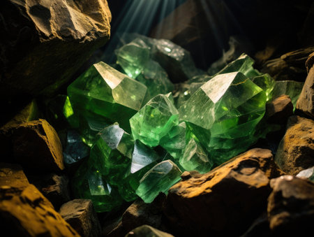 Bright Green Crystal Clusters Illuminated by Sunlight Reveal Stunning Natural Beauty in a Rocky Setting. Generative AI