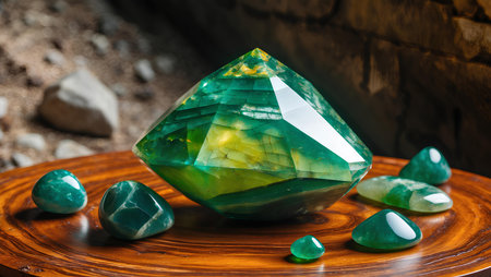 A striking emerald gemstone lies on a wooden desk, beautifully illuminated by warm light. The image captures the gem's clarity and rich green hue, creating a serene atmosphere.