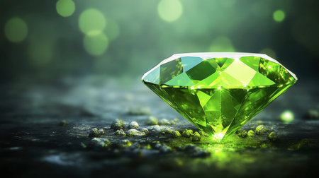Stunning green diamond is showcased on a dark textured surface, radiating elegance and luxury. Perfect for themes of beauty, fashion, and sophistication.
