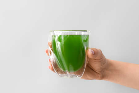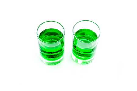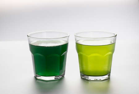 Dissolved powder spirulina and chlorella in a transparent glass cups on white background.