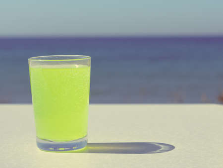 Dark Green Summer Drink on a yellow Background with Sunlight and Shadows