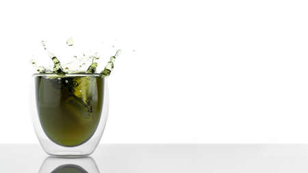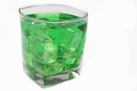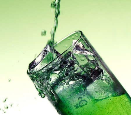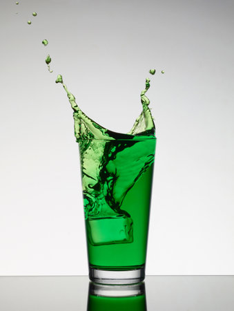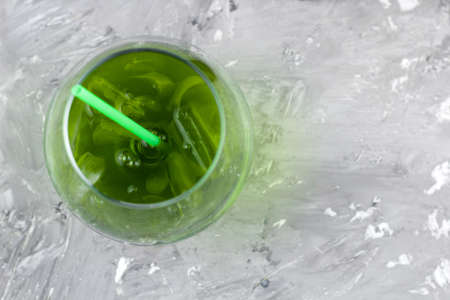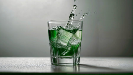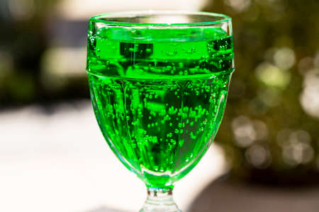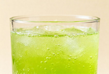 Refreshing cold green soda with ice cubes in a glass, close up of fizzy carbonation and vibrant summer beverage.