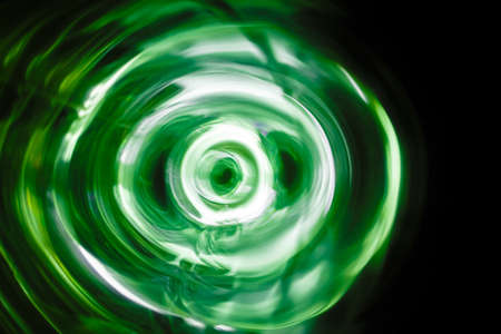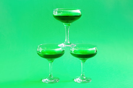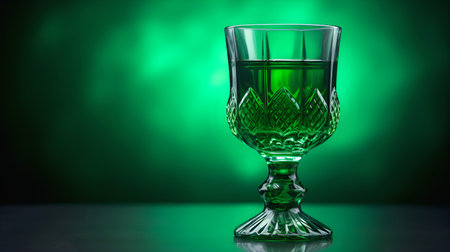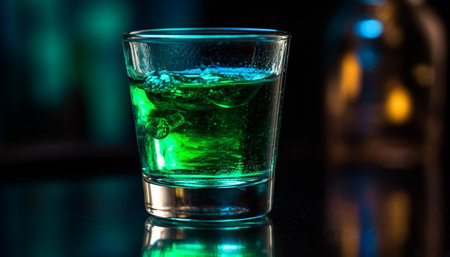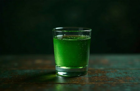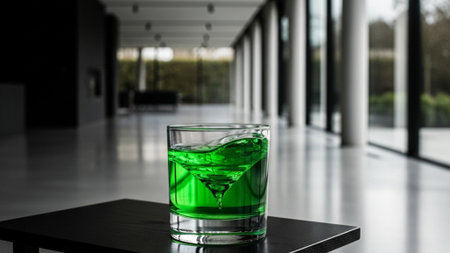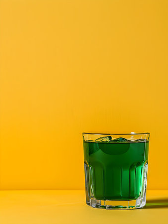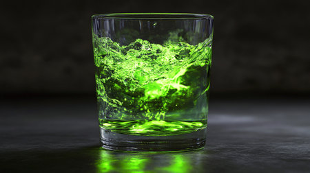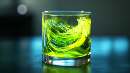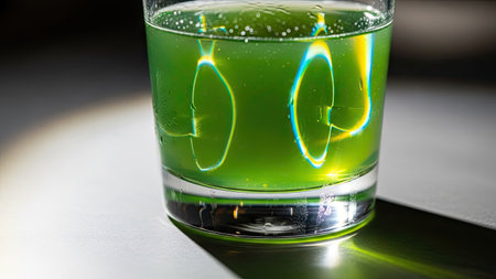 A close-up shot showcases a glass filled with vibrant green liquid. The scene reveals light patterns within the liquid, set against a surface with shadows. This image, with its distinctive color and composition, has potential use in advertising, illustrating concepts, or enhancing visual presentations.