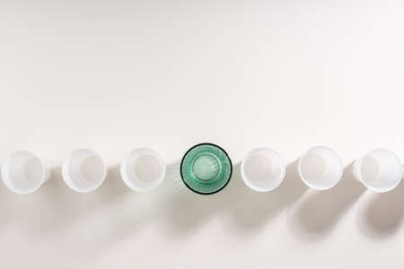 Glass and many plastic cups in a raw. Glass or plastic. Reusable versus disposable. Zero waste concept. Stop plastic pollution. Top view.