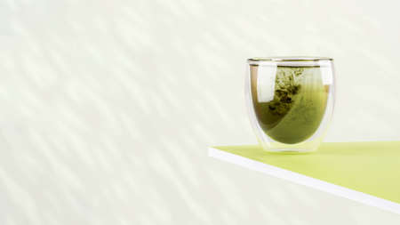 Glass of water with liquid chlorophyll and fresh herbs on a green table. Concept of superfood, eating healthy, detox and diet. Green background, vertical. isometric projection. copy space