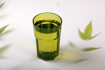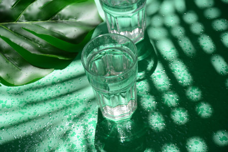 Green glass with water and a light background with plant leaves. Top view green glass of water with sunlight long shadow and refraction patterns and palm leaf trendy shadow