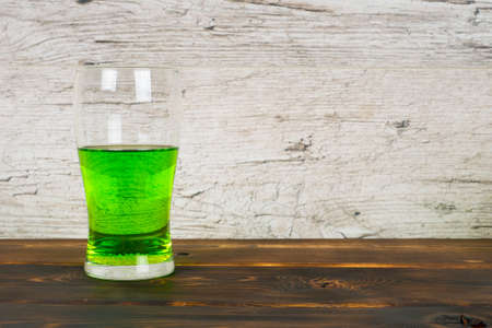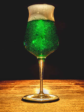 St. Patrick's day, green beer in an authentic glass goblet. Blurred background.
