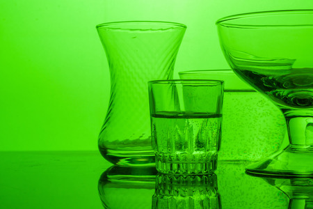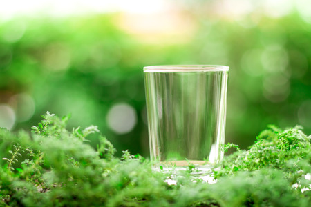Glass of clear water on a green background. The concept of natural products, no preservatives. Copy space