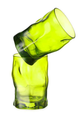 Green glass geometric cup with colorful shadow light rays on stone concrete background, angle view
