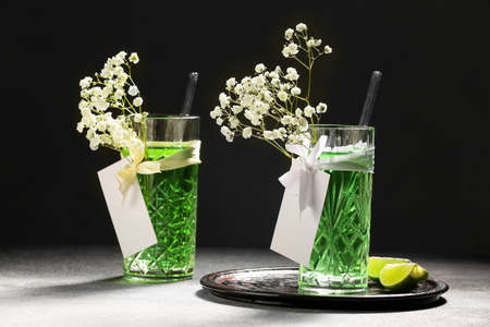 Refreshing summer drinks in crystal glasses on green bar tile background reflection harsh shadow. Cold gin vodka cocktail for hot summer day. Non alcoholic soda clear water mint tonic. Party vacation