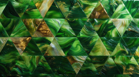This artistic image features a vibrant green triangle pattern with swirling textures and gold accents, ideal for modern design and creative projects.
