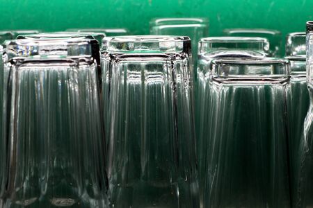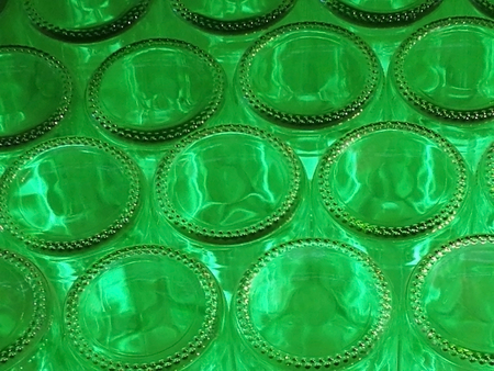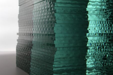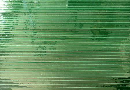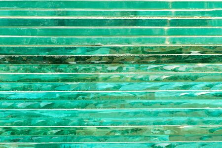 Glass sheets in horizontal position. Texture of green glass sheets. Transparent background from butt-ends of glass. Greenish texture. Light green background