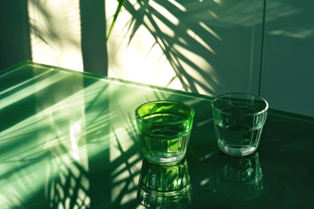 Two glass cups catch light, casting artistic shadows on a reflective surface, blending nature and minimalism in serene green hues. Generated A.I.