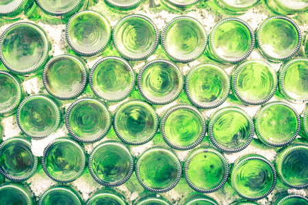 Wall of warehouse with many bottles Selective focus. form dust old cork bar row pile line rack wet vine ripe noir shot beer indoors green factory dark winery wheat light concrete malt blur stack round