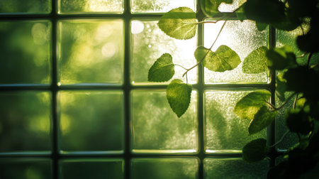 Bright sunlight filters through frosted glass blocks, illuminating green leaves climbing nearby, creating a serene and cozy atmosphere ideal for relaxation or reflection.