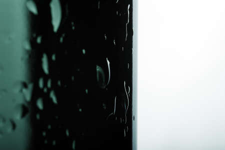 Green glass with water and a light background with plant leaves. Top view green glass of water with sunlight long shadow and refraction patterns and palm leaf trendy shadow