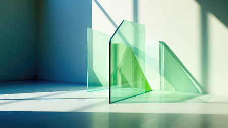 An artful composition of elegant green glassware and leafy stems, with playful light and shadows creating a serene ambiance. Perfect for adding a touch of nature beauty to your surroundings. AI generated