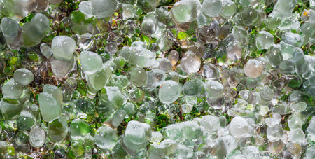 This image showcases a detailed abstract texture of shimmering green glass fragments, highlighting their unique shapes and reflections. Perfect for artistic designs.