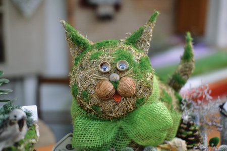 Funny cat made of felt. Christmas decoration. Christmas background.