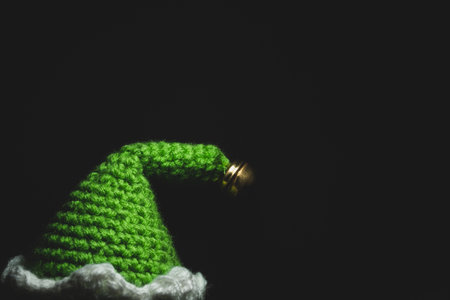 Portrait of Amigurumi crocheted or knitted stuffed toy green Elf hat on black background