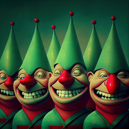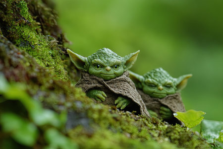 Joyful holiday characters in vibrant green costumes share a cheerful moment on a lush mossy base, illuminated by soft golden rays and a sparkling bokeh backdrop.
