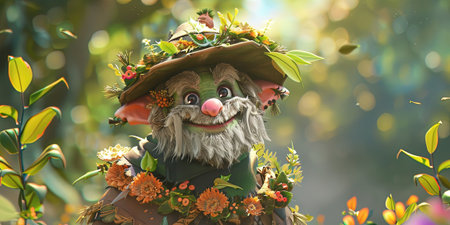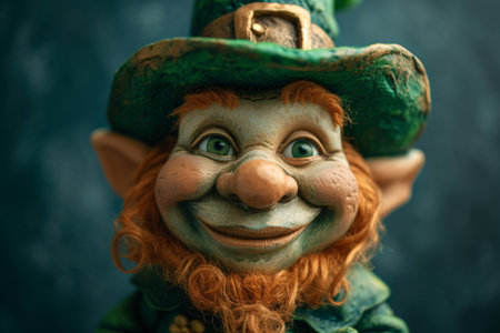 A happy leprechaun figurine stands in a lush green forest, surrounded by clover leaves. The leprechaun is wearing a green hat and has a red beard. The image is bright and cheerful, and evokes a sense of Irish folklore and tradition.