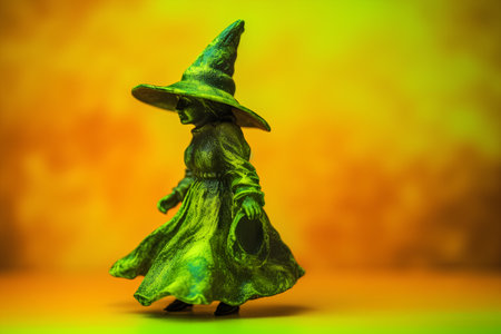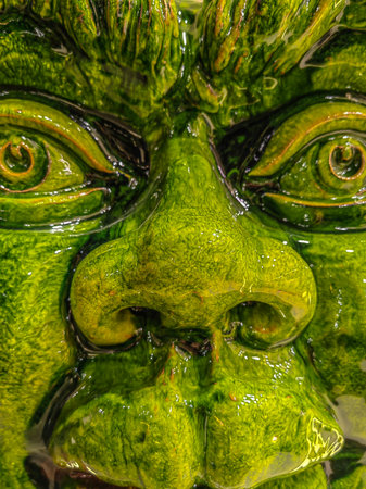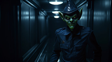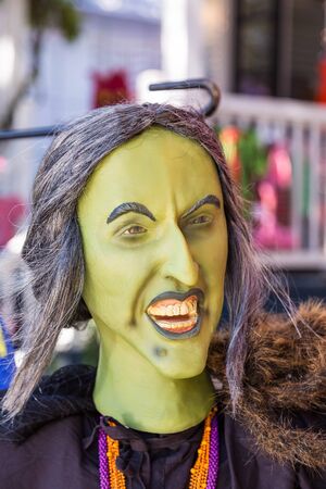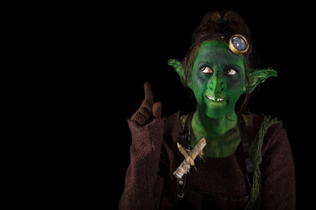 closeup, green female goblin with a long nose and freaky ears, Halloween or carnival theme
